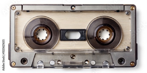 Isolated on a white backdrop, this vintage audio cassette tape encapsulates retro music nostalgia, transporting viewers back to a cherished era of analog sound.