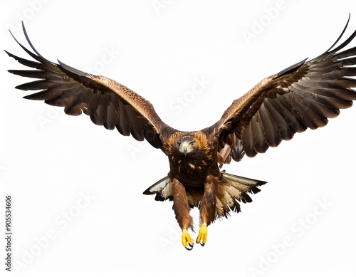 Isolated on white background, flying Golden eagle, Aquila chrysaetos, big bird of prey with outstretched wings. Front view. Eagle flying directly at camera. Action photo.
