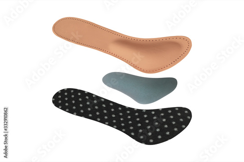 Isolated orthopedic insole on a white background. Treatment and prevention of flat feet and foot diseases. Foot care, comfort for the feet. Wear comfortable shoes. Medical insoles.
