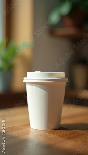 Isolated paper cup with lid on a wooden table, empty and still, still life, simplicity
