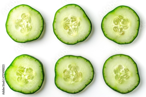Isolated pickle cucumber slices on white background Marinated small green cucumbers top view