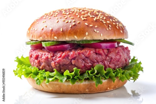 Isolated raw hamburger patty; ground beef, freshly made, ready to cook.