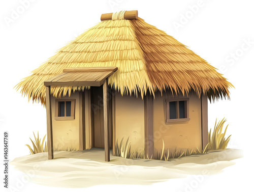 Isolated Rustic Hut with Thatch Roof and Simple Design