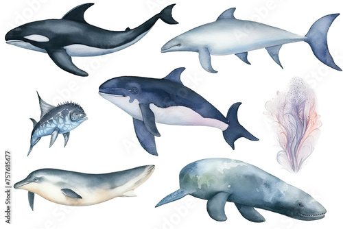 isolated sea starfish set illustration North whale white watercolor white animals cod narwhal fishes Orca background crab