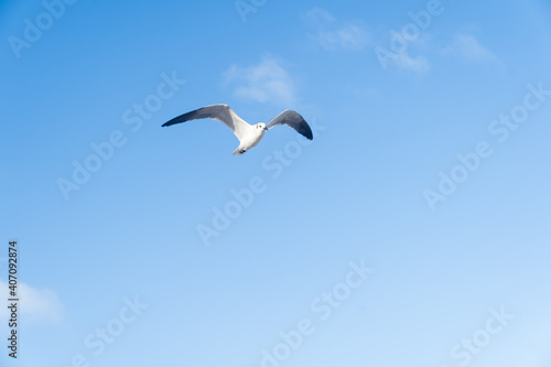 Isolated Seagull Gracefully Flying in the Blue Skies of Miami Beach.