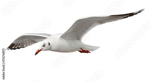 Isolated seagull soaring with its wings outstretched, flying freely through the air