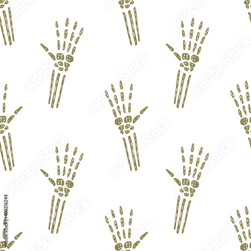 Isolated seamless haloween pattern with beige bone hands shapes. White background. Spooky print.