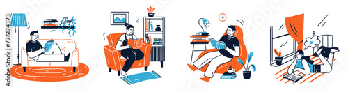 Isolated set of people characters reading book at home