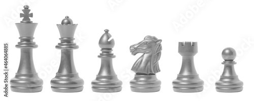 isolated silver chess set chess piece king, queen, bishop, knight horse, rook, pawn on white background. business, competition, strategy, decision concept.