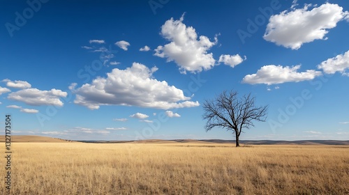 Isolated single tree standing in a golden dry grass field under a bright blue sky with fluffy clouds : Generative AI