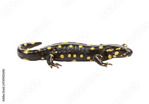 Isolated Spotted Salamander amphibian with yellow spots on black skin, amphibian macro shot