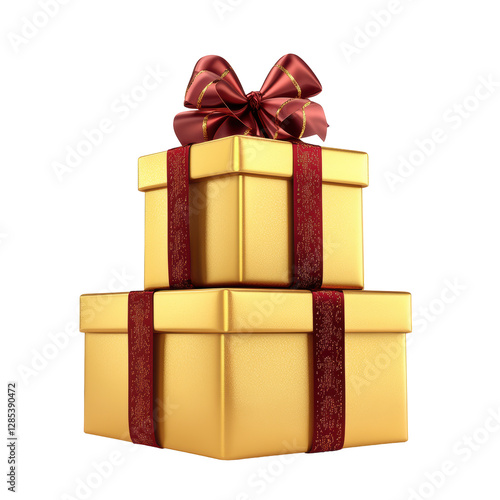 Isolated Stack of Two Golden Gift Boxes with Burgundy Ribbon