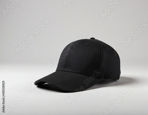 isolated studio shot of blank black cap mockup template on white background, empty space for logo or design, high-resolution for advertising and branding.