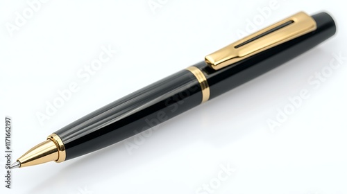 Isolated stylish black pen with a golden clip, placed on a solid white background.