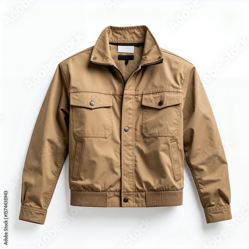 Isolated tan field jacket featuring flap pockets presented in studio lighting on white background