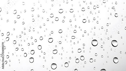 Isolated transparent water drops forming a minimalistic and abstract reflective pattern on a clean white background The water droplets capture the light and create a smooth shiny