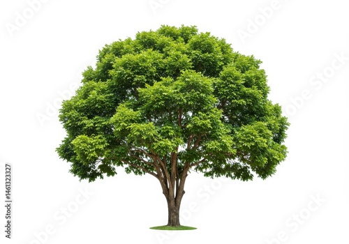 Isolated tree with lush green leaves and brown trunk stands against a bright white background in full view