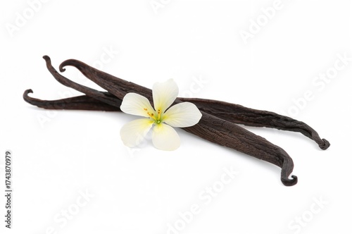 Isolated vanilla beans and a flower used as baking ingredients on a white background