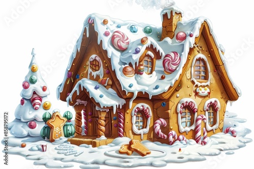 Isolated vector illustration of a gingerbread house with icing, candy decorations, and snow around it on a white background, whimsical and detailed