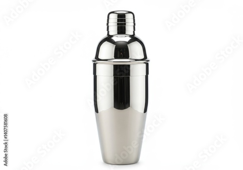 Isolated view of a shiny metal cocktail shaker on a plain white background in a centered composition