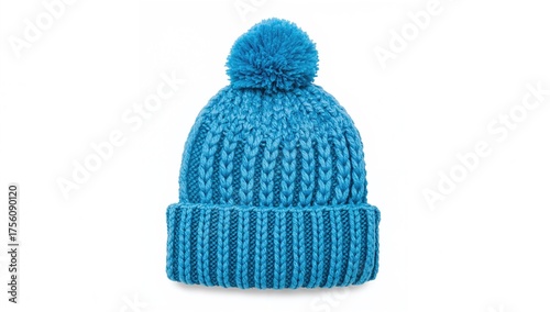 Isolated white backdrop featuring a knitted bobble winter cap in blue