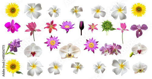 isolated white plumeria, sunflower, vanda orchid, hybrid orchid, pink waterlily, young sunflower bud and young lotus bud with clipping paths.
