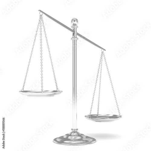 Isolated white silver scales on white background. Symbol of judgement. Law, measurement, liberty in one concept. 3D rendering.