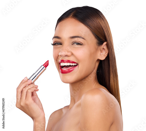 Isolated woman, lipstick application and happy in portrait, wellness and beauty by transparent png background. Girl, model and red lips with skincare, makeup and cosmetic process for facial change