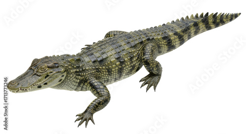 Isolated Yacare caiman in a relaxed position with visible scales and sharp teeth, side view
