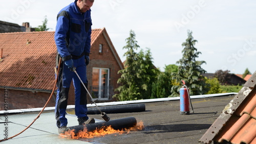 isolierter Dachdecker Arbeiter freigestellt auf Immobilien Flachdach Haus: Bitumen Dachbahn zuhause auf kaputtes Dach kleben, freier Platz