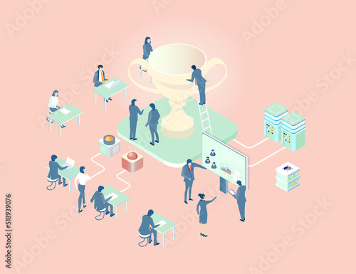 Isometric 3D business environment with business people working around golden trophy. Work together as team, success, reading data, searching, personal security infographic illustration.
