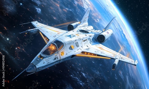 Isometric airplane in space, with futuristic designs and Earth visible in the background, exploring sci-fi possibilities