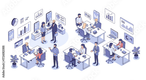 Isometric Business Office Teamwork and Data Analysis Illustration
