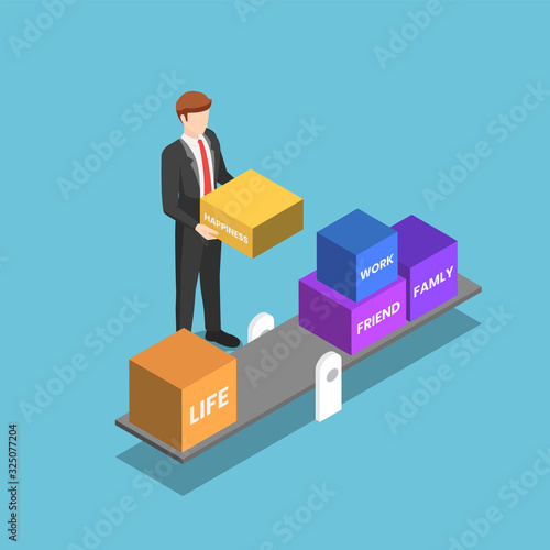 Isometric businessman trying to manage and balance his life