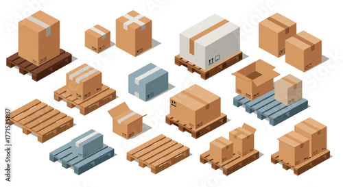 Isometric cardboard boxes and wooden pallets collection for shipping and logistics