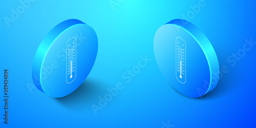 Isometric Celsius and fahrenheit meteorology thermometers measuring icon isolated on blue background. Thermometer equipment showing hot or cold weather. Blue circle button. Vector.