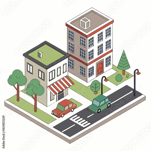 Isometric city street scene with buildings, houses, and trees in a detailed urban design