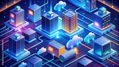 Isometric Cloud Computing Background with Bokeh Effect for Technology Concepts, Digital Solutions, and Data Management