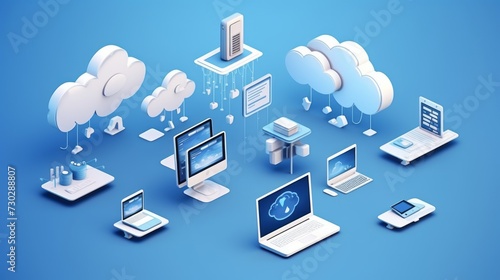 Isometric computer and technology equipment icons on white and blue background - creative banner for computer service, tech repair, cloud storage with copy space