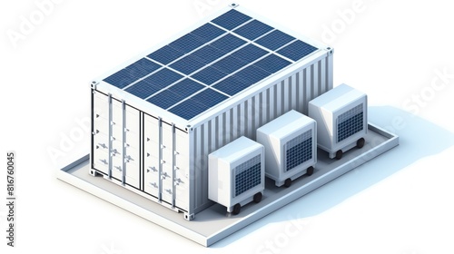 isometric concept of Modern energy storage battery systems, wind power, wind turbines and Li-ion battery containers, and solar panels in the background.