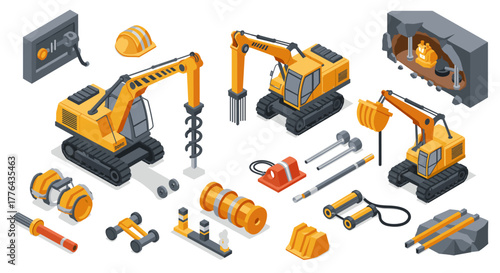 Isometric construction machinery and equipment set with excavators and tools