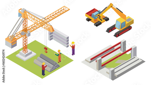 Isometric construction site featuring a crane excavator workers and building elements in a stylized view