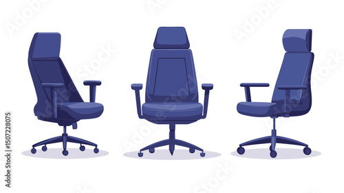 Isometric Dark Blue Office Chair Three Angle Views Against White Background