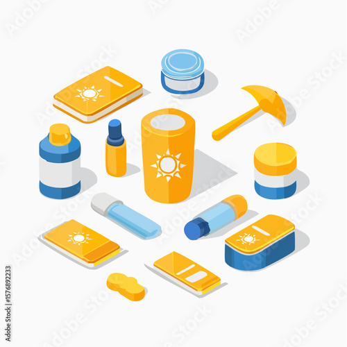 Isometric Flat icon set of Sun Protection Essentials