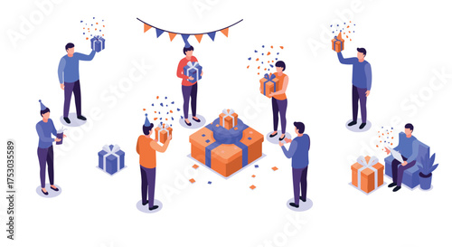 Isometric gift exchange celebration with people and presents in festive setting