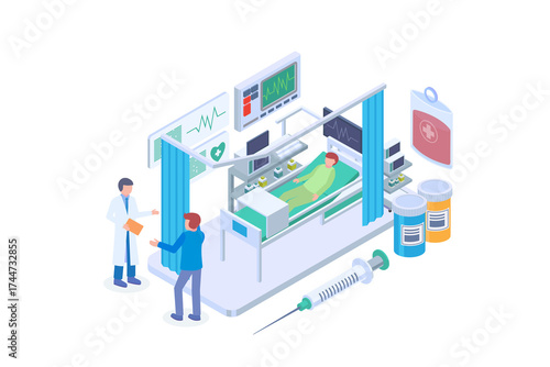 Isometric Hospital Room with Patient Doctor and Monitor on Transparent Background