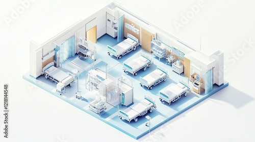 Isometric hospital ward; beds, equipment, clean; white background; healthcare illustration