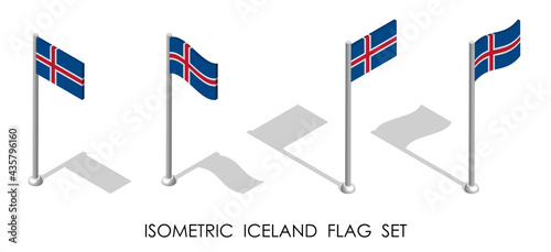 isometric Iceland flag in static position and in motion on flagpole. 3d vector