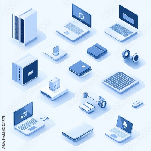 Isometric icon set featuring computers, laptops, and technology equipment in white and blue colors, ideal for creative banners, computer services, tech repair, and cloud storage solutions.