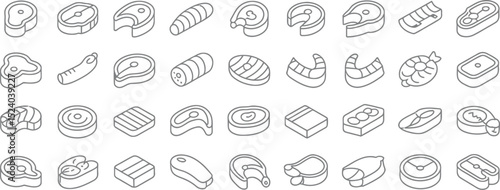 Isometric icons of various cuts of meat and seafood, isolated on white background